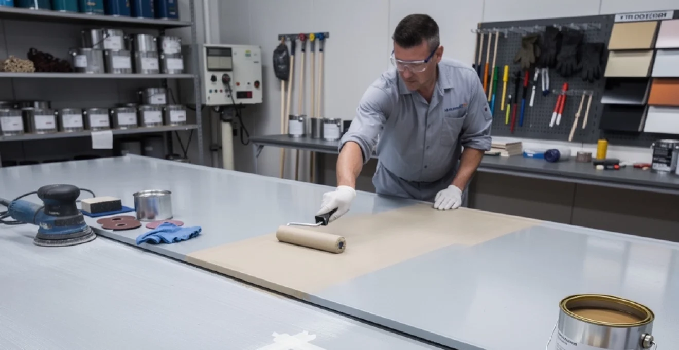 La séquence idéale sur une époxy susceptible de présenter un blush est la suivante : lavage/dégraissage à l’eau et au détergent doux, rinçage, séchage complet, ponçage léger, dépoussiérage, puis application de la surcouche. Si cette étape est négligée, même une peinture parfaitement compatible chimiquement risque de s’arracher en plaques, comme un autocollant mal collé sur une surface poussiéreuse. C’est l’une des causes les plus sous-estimées de défaillance lors du recouvrement d’époxy.